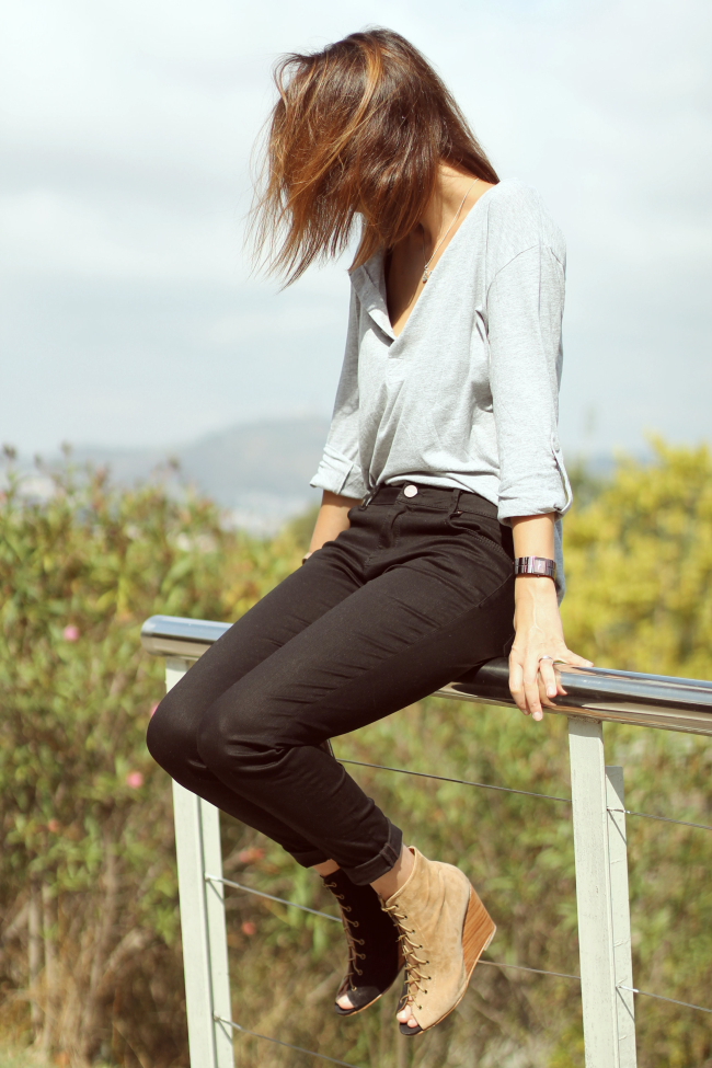 Decidí ponerme algo muy sencillo para darle protagonismo a mis botines. Esta temporada las camisetas grises en tonos oscuros se están viendo mucho. Estoy preparando un post más detallado llamado: “Grey is the new White”, estén atentas.