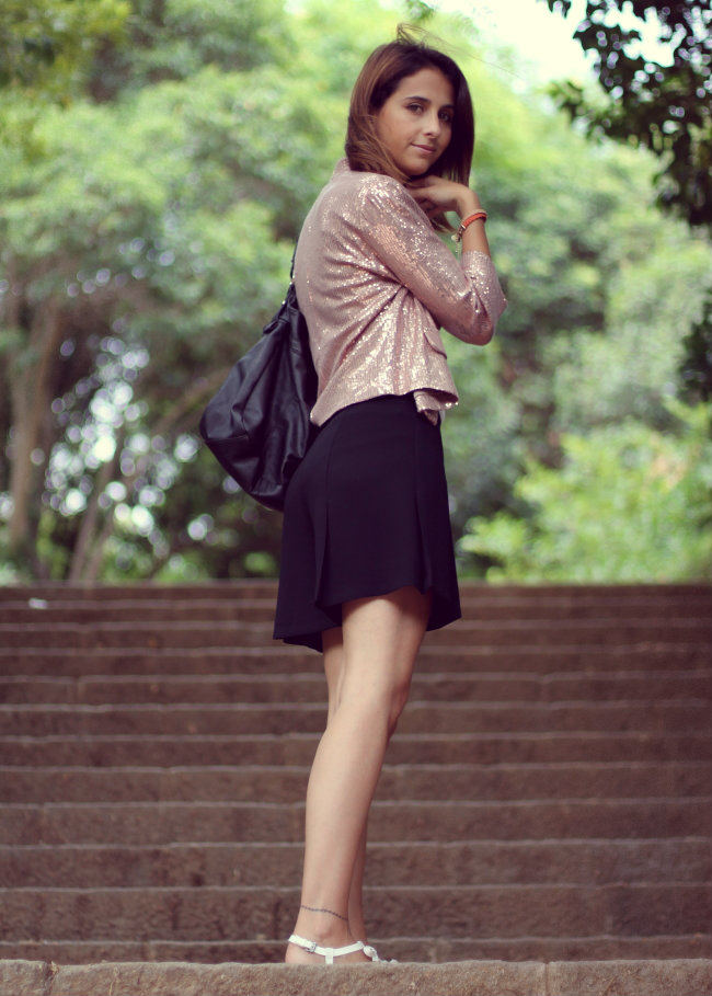 Shorts: zara basics (s/s12) – top zara: (old) – bow flats: zara (s/s12) – sunglasses: ray-ban (old) – sequin jacket: forever 21 (old) – studded bag: asos (very old haaaa)
