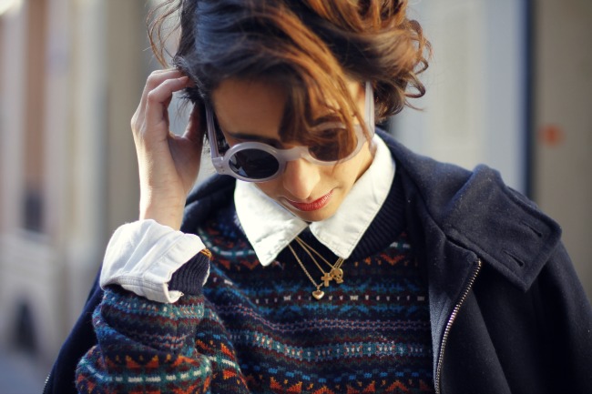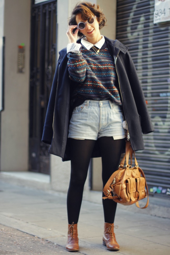 sunglasses: H&M (s/s 2012) geometric sweater: H&M (a/w 2012/13) – coat: ZARA (a/w 2012/13) – shorts: LEVIS (old/vintage) – tights: H&M – ankle boots: ZARA (a/w 2012/13) – necklace: MAKEDOONIA (a/w 2012/13)