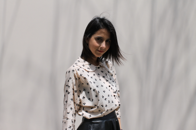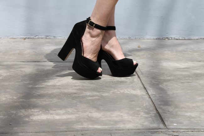 Falda cuerina – leatherette skirt: Forever 21 / Blusa lazos – bow blouse: Forever 21 / Zapatos plataforma – platform peep toes: Gretta by Steve Madden / Bolso – studded leatherette bag: Asos