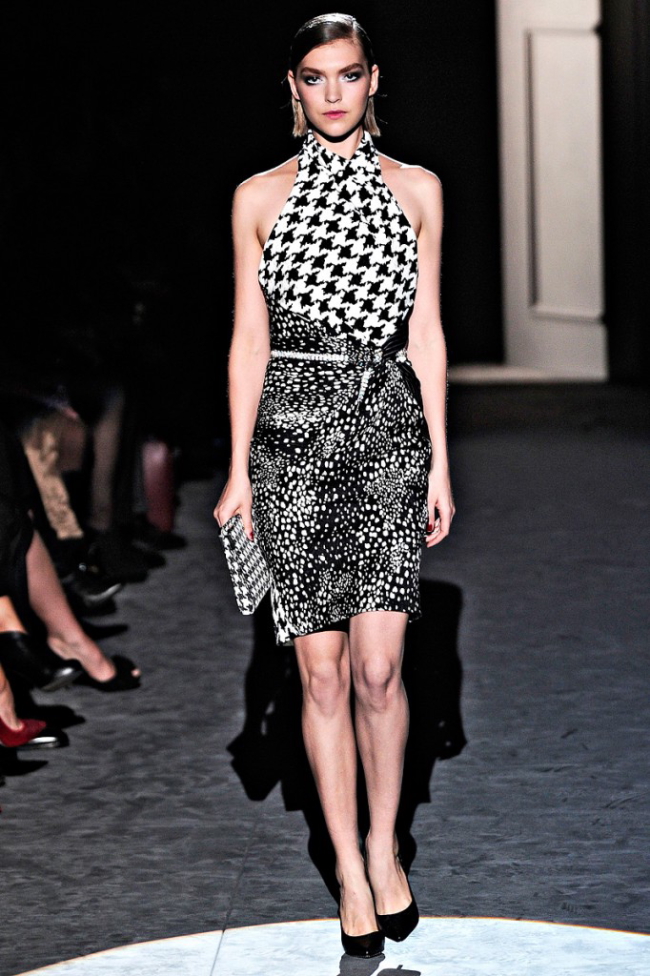 La tendencia de Pata de Gallo o en inglés Hounstooth nos recuerda a la moda de los años 60-70 o el look Dandy, cuando Twiggy puso de moda los telares “British” en las piezas “tweed” con estampados, en abrigos, blusas y hasta pañuelos. Esta tendencia se vio por todos lados en las pasarelas de los Fashion Week 2011-12 pero esta vez evolucionada con cortes femeninos, animal print, charol, sedas y muchos escotes.