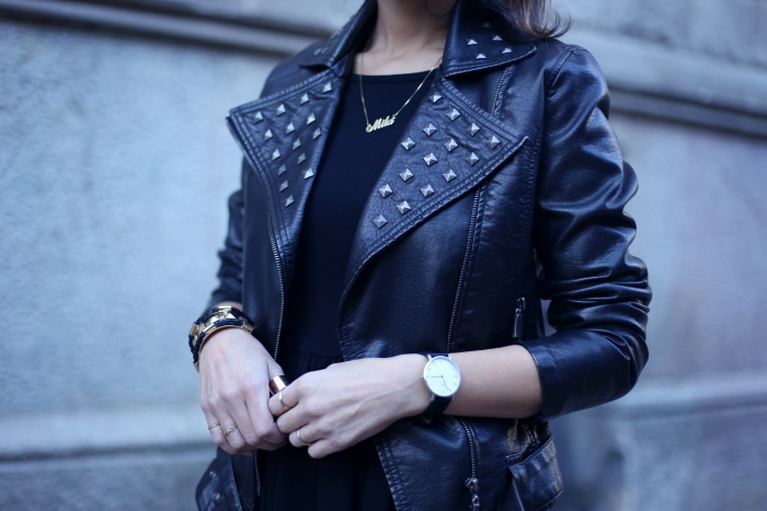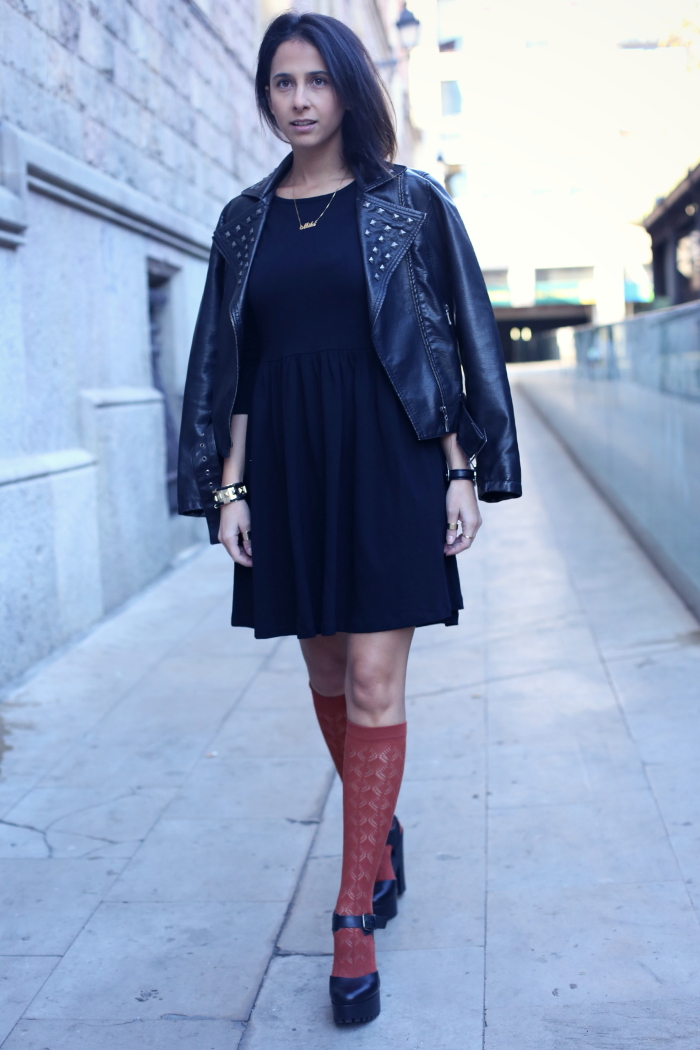 ¿Se acuerdan de este look? Lo usé para el evento de QK hace tiempo pero no había tenido oportunidad de mostrarles las fotos. Si describiera mi look como: un vestido skater con medias a la rodilla, zapatos de correa y accesorios dorados, cualquiera pensaría en un estilo lolita pero qué pasaría si describiera mi look como: un estilo negro con piezas de cuero y tachas, cualquiera pensaría en un estilo más rocker. Por eso me gusta mezclar y jugar cuando pienso en qué ponerme ¿A ustedes qué les parece?
