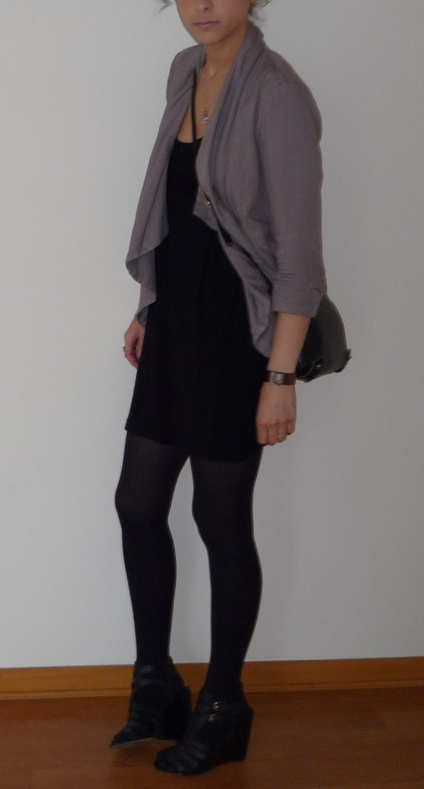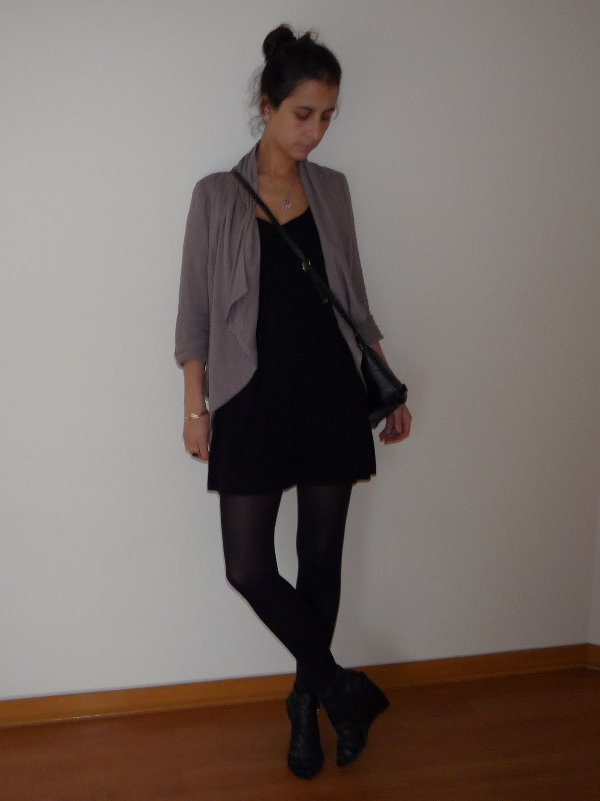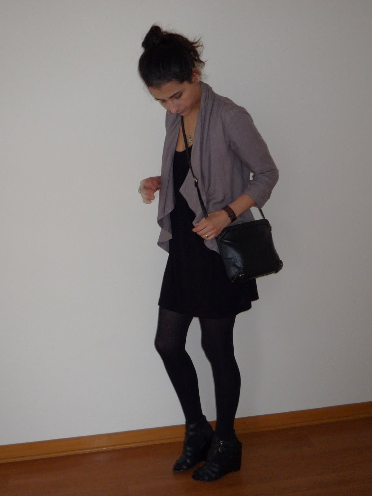 Look: sandalias nine west de cuña, pantys tupidas, mi bolso largo loewe vintage y un semi cardigan-chaqueta color gris rata.