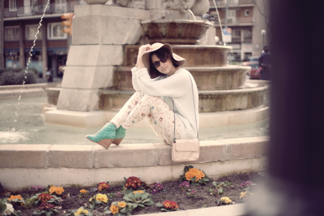 sweater: h&m (similar) – floppy hat: h&m (similar) – floral pants: pull&bear (similar) – lace ups: catu shoes (similar) – chain bag: zara (similar) – sunglasses: vintage (similar)