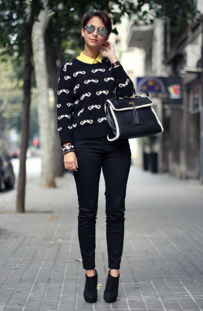 moustache cardigan: ax paris (a/w 12/13) – chiffon blouse: carolina sarda – skinny pants: zara woman (a/w 12/13) – messenger bag: forever 21 – ankle boots: zara (old) – mirror glasses: ax paris (a/w 12/13) – studded bracelet: mango (a/w 12/13) gold bracelet forever 21 – cross ring: stradivarius.
