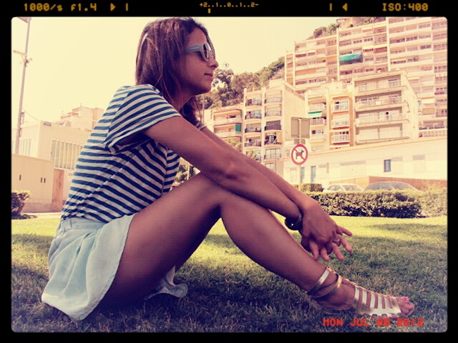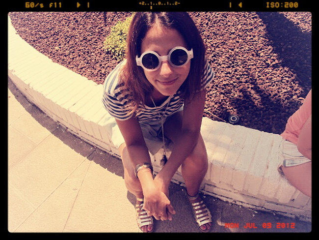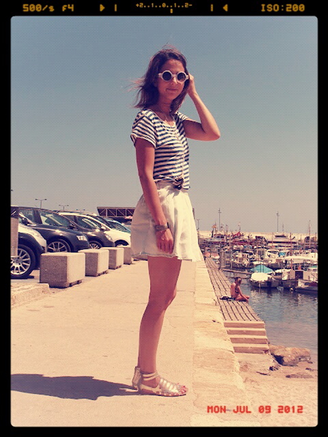 falda denim: zara – camiseta a rayas: h&m – sandalias romanas doradas: h&m – gafas redondas: h&m