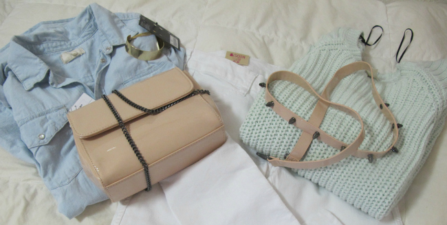 camisa denim desteñida h&m – ankle cuff dorado h&m – mint knit sweater h&m – bandolera charol zara – cinturón charol con tachas zara