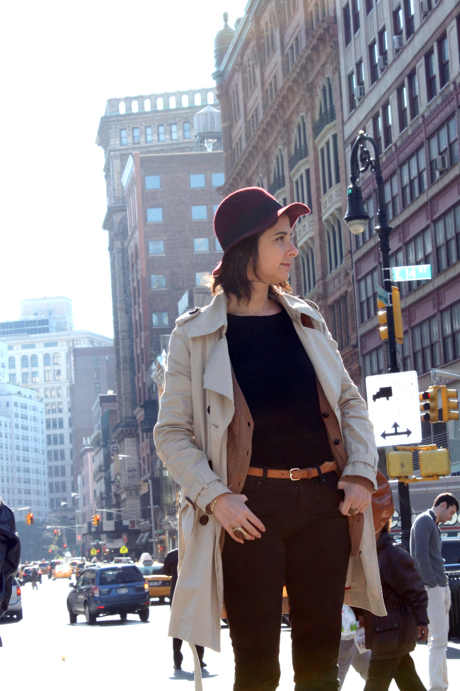 pitillos – skinny pants: H&M / botines – ankle boots: Almudena Miliani / correa – leather belt: H&M / cardigan: H&M / trench coat: GAP / bolso – messenger bag: MANGO / sombrero – burgundy hat: H&M / accesorios – accesories: H&M & Forever 21.