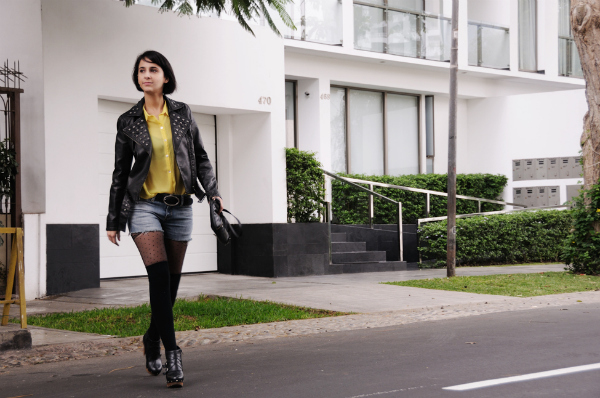 Shorts (ex jeans): Express – Blusa: Carolina Sarda via TrendStudio – Medias/polka dots stockins: Calzedonia – Medias/knee high socks: ASOS – Botines/ankle boots: MARQUIS – Casaca/Jacket: Forever21 by TUSTOR – Bolso/Bag: Loewe (vintage)